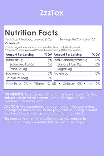 BETTER REST, RELIEVE STRESS The holidays is usually a pretty stressful time of year. And probably the most major keys to looking and feeling your best is getting enough rest. ZzzTox calming tea includes Rooibos Leaf, Chamomile Flower, Valerian Root and more. Our blend promotes restful sleep, helps fight problems with insomnia and eases your holiday anxiety.